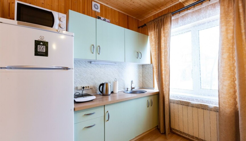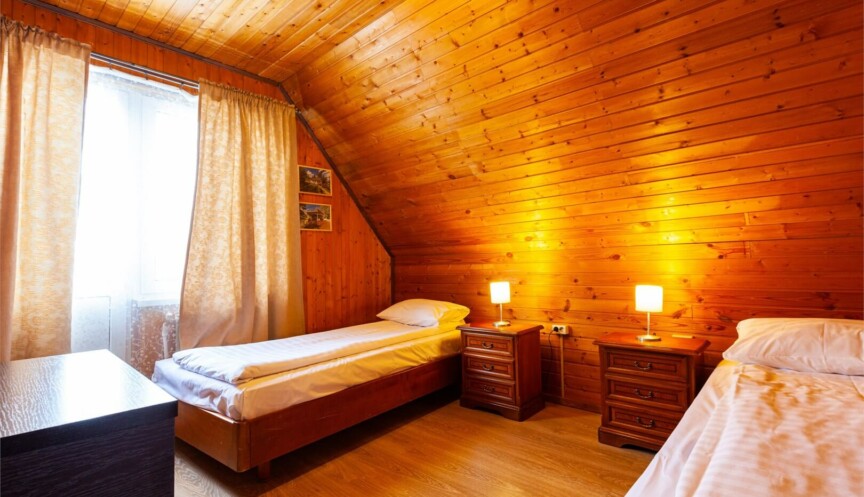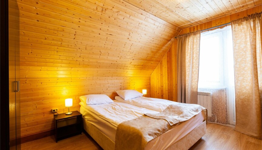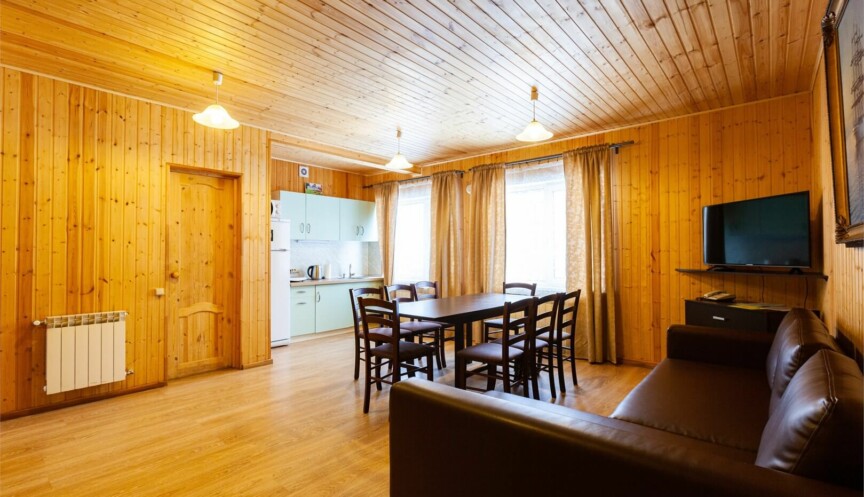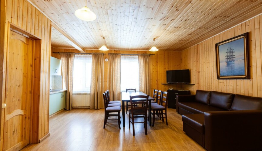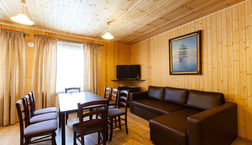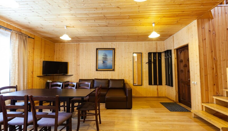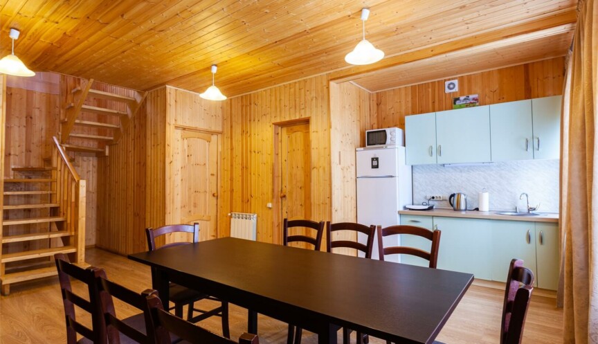 Большой дом из бруса на 4 спальни, оборудован собственной небольшой электрической сауной. Столовая зона с кухней и всем необходимым оборудованием для комфортного отдыха.