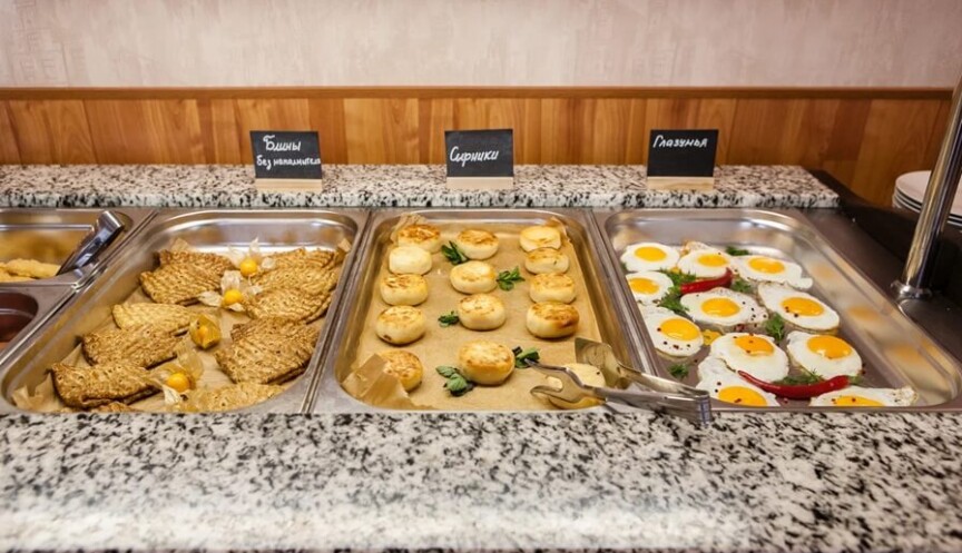Питание для гостей организовано по системе «шведский стол» или «сет-меню» (в зависимости от загрузки) и сервируется в основном ресторане «Панорама» в главном корпусе отеля на первом этаже.